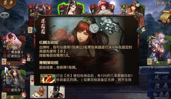 对于妲己的噬心和媚国,经过上几轮的记录,大家貌似都已经看得很清楚,妲己的进攻效果并不是很明显,看样子娇弱的狠,那么我们在本环节,同样采用娇弱的副将出马。主将李世民,最要针对锦囊和弃牌以及画地为牢进行抵御,以及自己的攻心技能进行攻击,可以很好的控制住局面。我们选择陈圆圆拥有主动技能红颜,在出牌时,可以使用一张牌让两名男性英雄进行决斗,先指定的英雄使用杀,技能每回合限用一次。被动技能楚楚,在回合结束的时候,获取一张牌,所谓再给一张。多一张牌就是多一个机会。同时可以让对对面两个英雄发动红颜,比一比究竟谁更美。而小乔自带的意如玉既不怕被偷走,同时可以根据运气的程度进行判定。我方军队已经做好妲己最后一站的准备。