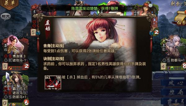 中国历代的“红颜祸水”里,最恶毒的恐怕莫过殷商时代纣王的宠妃妲己 了。而且两个人犯起“混”来,简直算得上“夫唱妇随”,惊人的合拍了。商纣拥有主动技能无道,当受到杀以外的伤害,可以选择判定;判定牌为红桃,则伤害来源受到1点伤害。主动技能众判,出牌时,你可以使用黑桃手牌当做万箭齐发。商纣的技能貌似和妲己并不是非常合拍。虞姬拥有主动技能舍身,每受到一点伤害,可以获得两张牌给任意英雄。被动技能诀别,求药的时候,可以放弃求药,指定一名男性英雄获取你的手牌和装备牌。要时刻注意虞姬的牌施舍给谁,吕雉拥有主动技能鸠杀,在求药前,可以使用药让求药英雄阵亡,蓄谋,回合结束,可以获取三张牌,我们一定要时刻注意三张牌在哪一回合收入囊中。