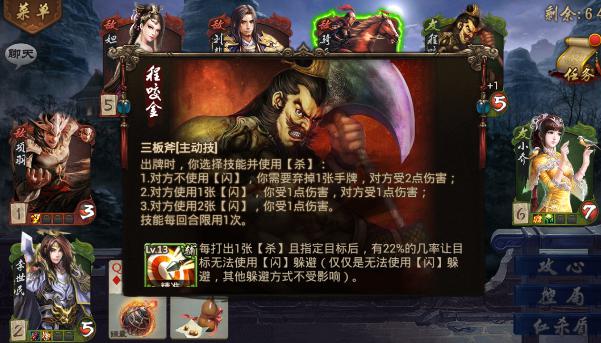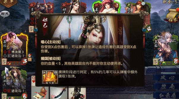 妲己拥有主动技能噬心,在受到X点伤害后,可以弃掉一张牌让造成伤害的英雄受到X点伤害。媚国技能,在血量小于5时,其他英雄回合内不能对你主动使用杀。可以暂时的保护自己,而刘邦拥有主动技能驭人,在出牌时,可以放弃自己的X张牌,重新获取X张牌,技能每回合限制使用一次,这个需要注意,也许运气好,想要的通透都会来。同时拥有贪之手辅助,在摸牌阶段进行判定,有5%的几率可以从牌堆中额外摸取一张牌。骑兵拥有主动技能冲锋,每次使用杀时选择英雄数量加1(最多三名),拥有轻灵辅助技能,在打出闪时,有10%的几率从牌堆中摸出一张牌。项羽拥有被动技能霸王,在使用杀的时候,英雄需要使用两张闪才能抵消,与之决斗的英雄需要使用两张杀。所以我们必须时刻备着杀不然就会掉血了。拥有强化辅助技能,在打出杀使目标掉血,有5%的几率给目标追加一点血的伤害。