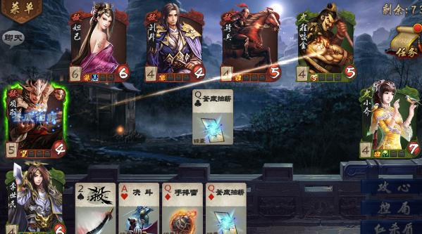 妲己作为先手,我方三位英雄,对面四位英雄,妲己发动控局,弃掉一张黑桃7。项羽装备了进攻马,发动霸王技能打的李世民没有一点点防备,赶紧回击打出釜底抽薪弃掉他的马。小乔的玉如意在游戏中很有优势,同时需要攒杀防备项羽的霸王,程咬金在游戏中一定要算好对面玩家闪的数量,出手就是二血。
